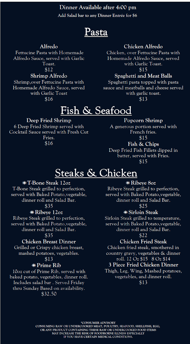 For dinner, the restaurant delivers even more impressive choices, ideal for those seeking something more substantial. The Steak Sandwich provides a juicy, tender steak served with all the right fixings, while meat lovers can indulge in a perfectly grilled 24oz Sirloin Steak. For a more decadent experience, the 12oz Bacon-Wrapped Tenderloin promises a melt-in-your-mouth tender texture, complemented by the smoky richness of bacon. The 12oz NY Strip is another classic, boasting a flavorful cut of meat, and the 22oz T-Bone offers a hearty portion for those with a big appetite.