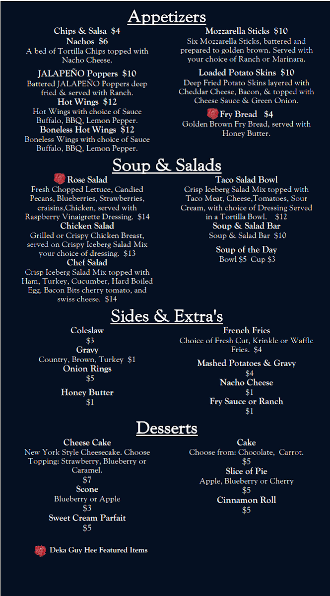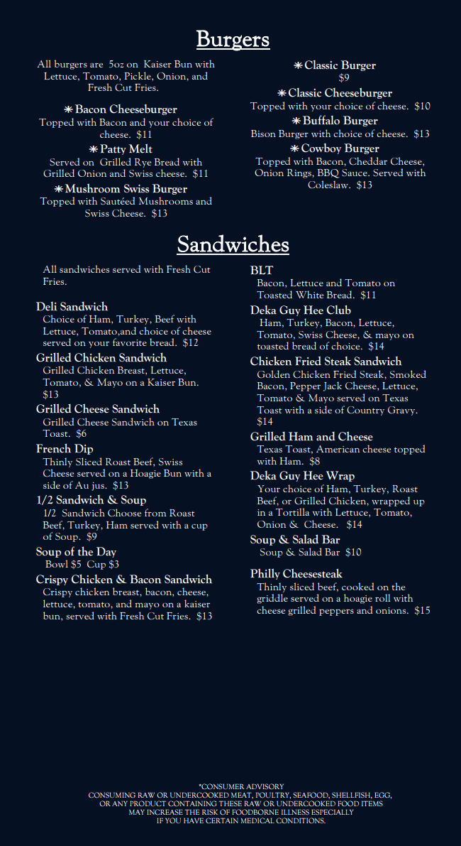 With its diverse selection, Deka-Guy Hee Restaurant excels in providing satisfying meals for every craving, from classic burgers to indulgent steak dinners.